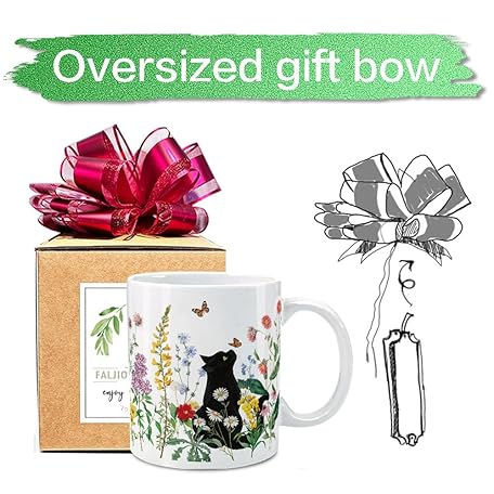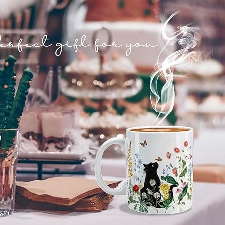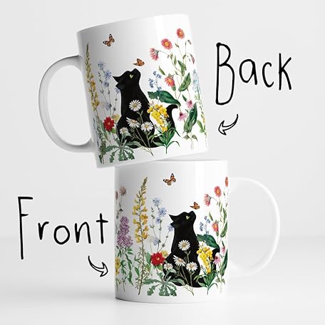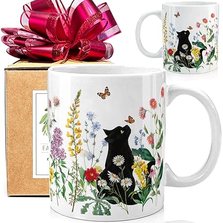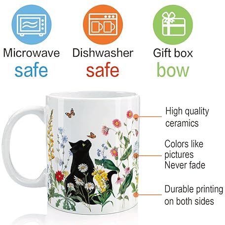 Thông tin sản phẩm FALJIOK Cute Black Cat and Flowers 11oz Porcelain Coffee Mug, Gift for Cat Lover, Mom, Friend, Bestie