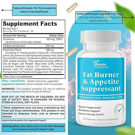 Fat Burner for Women & Men - Appetite Suppressant for Weight Loss - Pills with Chromium, Caffeine & Green Tea Extract - Metabolism Booster Thermogenic Weight Loss - 35 Capsules