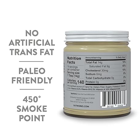 Thông tin sản phẩm Fatworks Fine Filtered 100% Grass-Fed Goat Milk Ghee, Pasture Raised on Small Family U.S. Farm. KETO, PALEO, WHOLE 30 APPROVED, 7.5 oz.