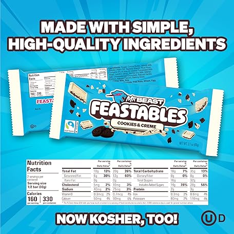 Thông tin sản phẩm Feastables MrBeast Cookies & Creme Chocolate Bar, New Flavor, King Size Candy Bar for Adults & Kids, Candy Bars for Snacks, Gifts, or Dessert, Sweet & Creamy Fairtrade Cocoa, 2.1 Oz Each, 10 Count