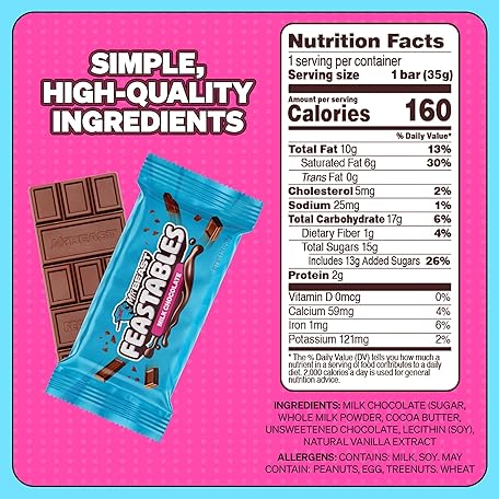 Thông tin sản phẩm Feastables MrBeast Milk Chocolate Chocolate Bar, Full Size Bar for Adults & Kids, Candy Bars, Snacks, Gifts, or Dessert, Sweet & Creamy Fairtrade Cocoa, 1.24 Oz Each, 24 Count