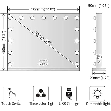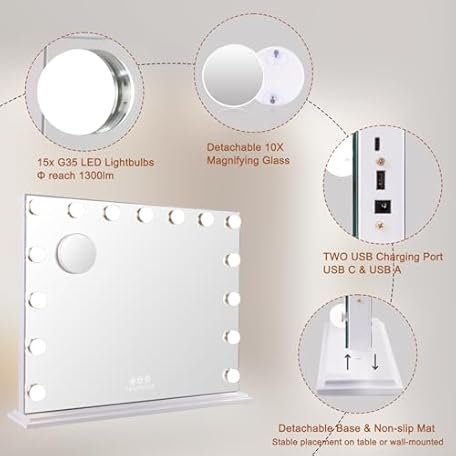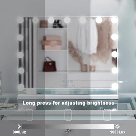 Thông tin sản phẩm FENCHILIN Vanity Mirror with Lights, Hollywood Lighted Makeup Mirror with 15 Dimmable LED Bulbs for Dressing Room & Bedroom, Slim Metal Frame Design, White
