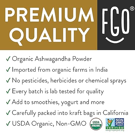 Thông tin sản phẩm FGO Organic Ashwagandha Root Powder, 16oz Resealable Bulk Bag, Non-GMO, Indian Ginseng, Withania Somnifera, Sourced from India (Pack of 1)