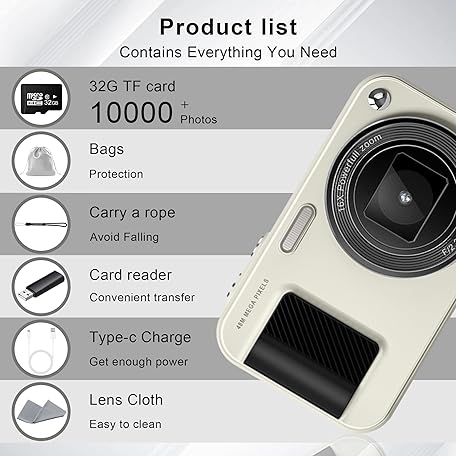 Thông tin sản phẩm FHD 1080P 48MP Kids Camera, Autofocus Point and Shoot Digital Camera with 32GB Card, 16X Zoom Anti-Shake, Compact Small Camera with 1500mAH Built-in Batteries for Boys and Girls