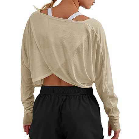 Fisoew Womens Long Sleeve Workout Tops Athletic Shirts Cropped Crossover Back Loose Running Gym Tee with Thumb Holes