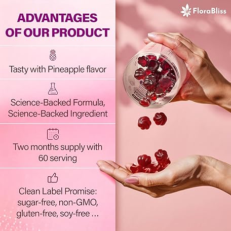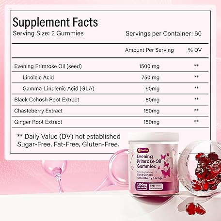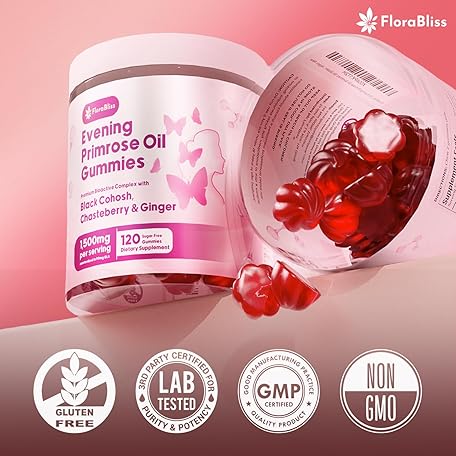 Thông tin sản phẩm FloraBliss 120 Evening Primrose Oil Gummies | 1500mg | with Black Cohosh, Chasteberry, Ginger Extract for Daily Women's Wellness Support | Vegan, Non-GMO, Sugar-Free