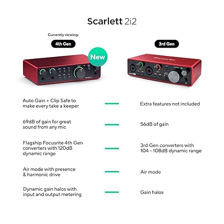 Thông tin sản phẩm Focusrite Scarlett 2i2 4th Gen USB Audio Interface for Recording, Songwriting, Streaming and Podcasting — High-Fidelity, Studio Quality Recording, and All the Software You Need to Record