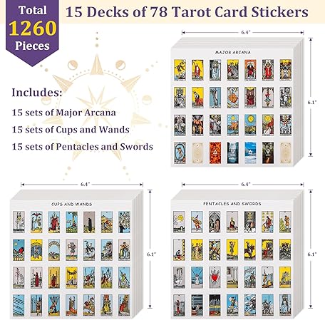 Thông tin sản phẩm Fofeadm 1260 PCS Mini Tarot Stickers for Journaling, 1.25" x 0.78" Tarot Card Stickers Based on Rider Waite Tarot Deck, 8 Tarot Cheat Sheet Included