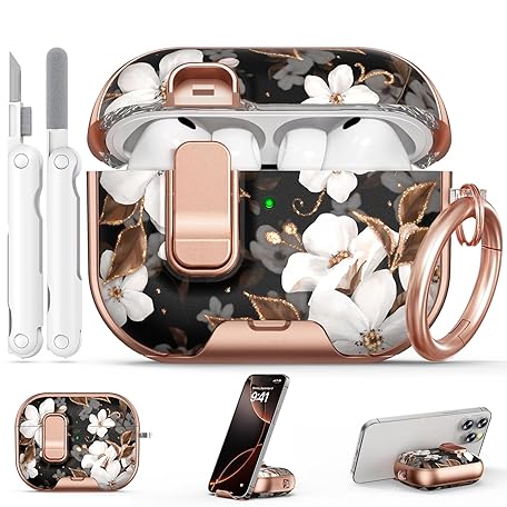 for AirPod Pro 3 Case 2025, with Safty Lock & Phone Stand for Floral AirPod Pro 3 Generation Case Cover for Women Girly, iPod Pro 3 Cases with Keychain & Cleaner Kit - Black Gold Flower