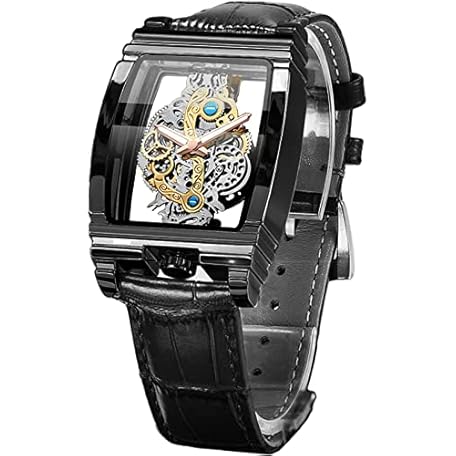 • FORSINING Men's Luxury Hollow Skeleton Watch Retro Gorgeous Gear Carving Design Rectangle Tonneau Large Dial Leather Belt & Stainless Steel Band Quartz Wristwatch Not Mechanical Watches