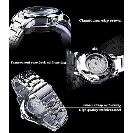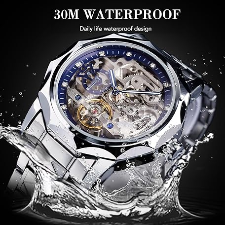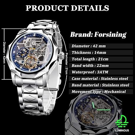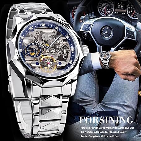 • FORSINING Men's Skeleton Automatic Mechanical Watch with Diamond-Cut 12-Sided Bezel & Exposed Gears & Tourbillon Design, Unique Rhombus-Link Stainless Steel Bracelet Self-Wind Wristwatch