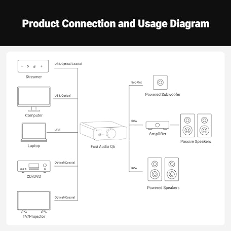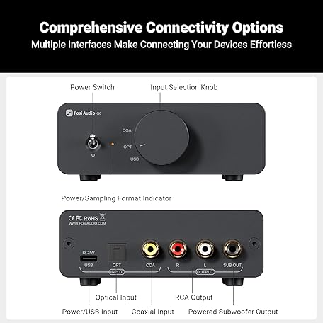 Thông tin sản phẩm Fosi Audio Q6 Mini Desktop DAC, USB C Digital to Analog Audio Converter for Home Stereo Amplifier and Headphone Amp, Optical/Coaxial Input, RCA Output/Sub-Out, High-Resolution 32bit/768kHz DSD512