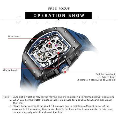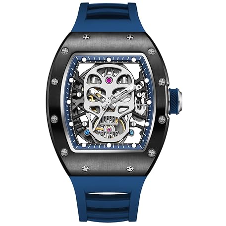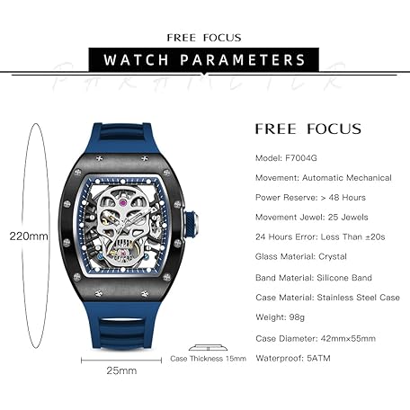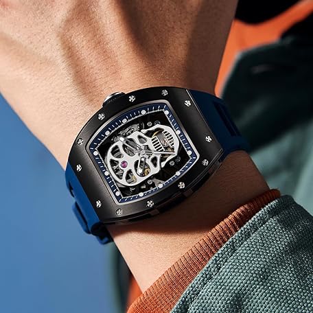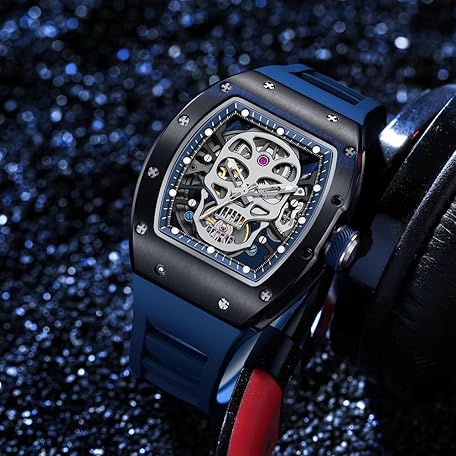 Free Focus Unique Men Watches,Automatic Mechanical Watch,Luxury Skeleton Tonneau Watches for Men with Stainless Steel Case and Black Silicon Band (Rubies Movement/5ATM Waterproof/Super_Luminous)