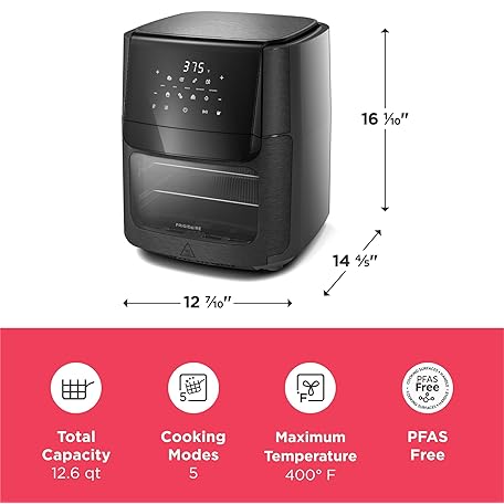 Thông tin sản phẩm Frigidaire 5-in-1 Air Fryer Combo Oven with Viewing Window, Large 12.6 QT Capacity, Digital Display, 5 Cooking Modes, 7 Recipe Presets, Automatic Shake Reminder, PFAS-Free Cooking Surfaces, Black