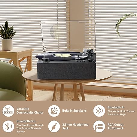 Thông tin sản phẩm Fully Automatic Record Player, Bluetooth Belt Drive Vinyl Turntable, Magnetic AT-3600L Cartridge, Bluetooth in & Out, Hi-Fi Stereo Speakers, Aux in Headphone, RCA Out, Anti-Resonance - Black