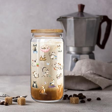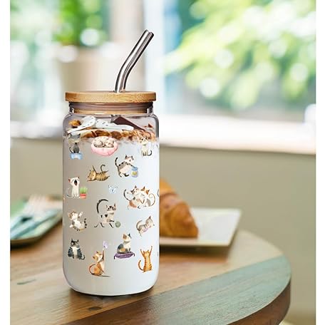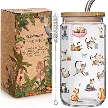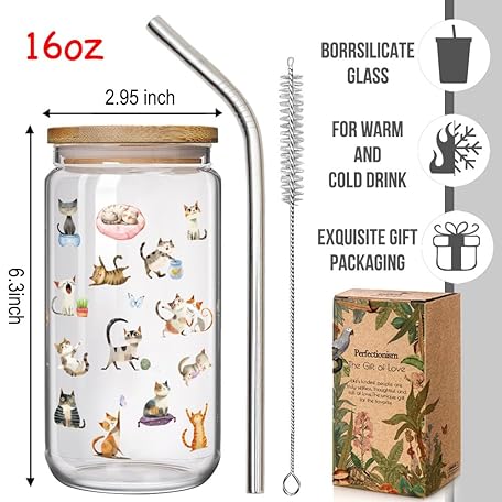 Funny Cat Glass Cups with Lids and Straws Gifts for Love Cats Women Girls, Cute Cool Cat Lover Gifts Decor Stuff Accessories, Cats Lovers Owners Christmas Gift for Daughter Sister Aunt Best Friends