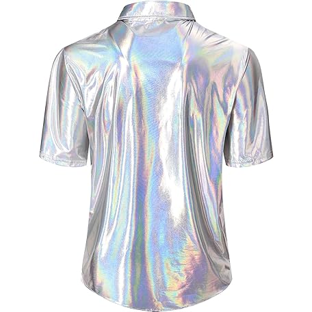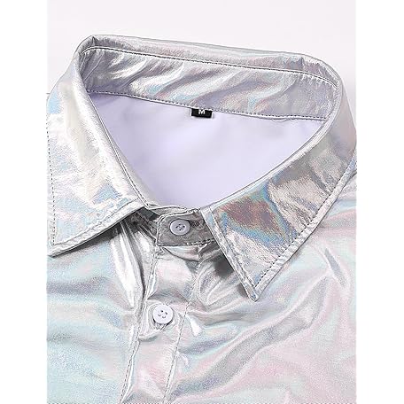 • Funny World Mens 70s Disco Outfits Metallic Short Sleeve Sparkling Button up Sequin Shirts, Silver