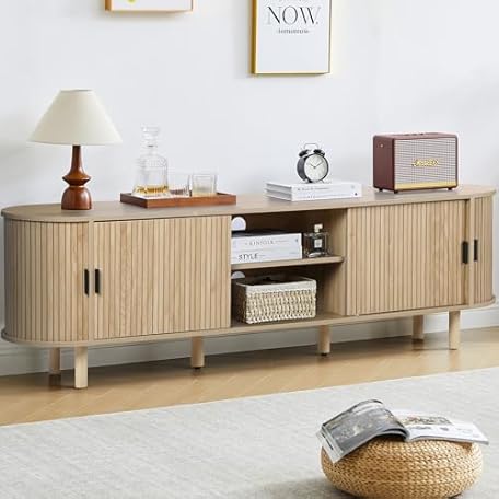FurSch 70.87”Tambour TV Stand for 50-80 Inch, Mid Century Entertainment Center with Large Storage Cabinet & Open Shelves, TV Console with Sliding Doors for Living Room, Bedroom (Natural, 70.87inch)