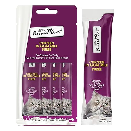 Fussie Cat Super Premium Chicken in Goat Milk Puree, lickable cat Treats, 0.5oz Pouch Pack of 4