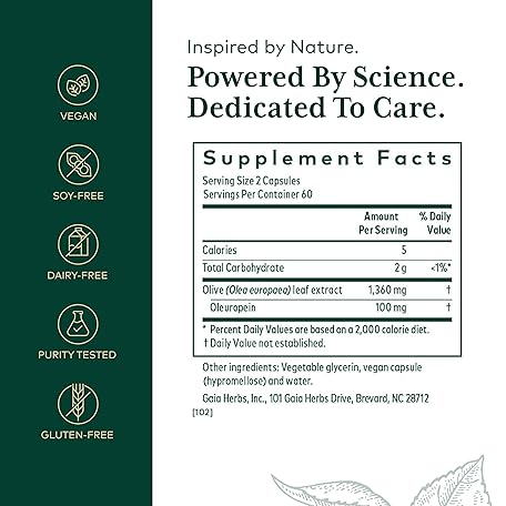 Sản phẩm Gaia Herbs PRO Olive Leaf 1360 - Supports Immune System & Heart Health* - Concentrated Single-Herb Formula - with Oleuropein - Gluten-Free - 120 Liquid Phyto-Caps (60 Servings) đang được bán với giá ưu đãi là $64.2555 tại nước Mỹ.