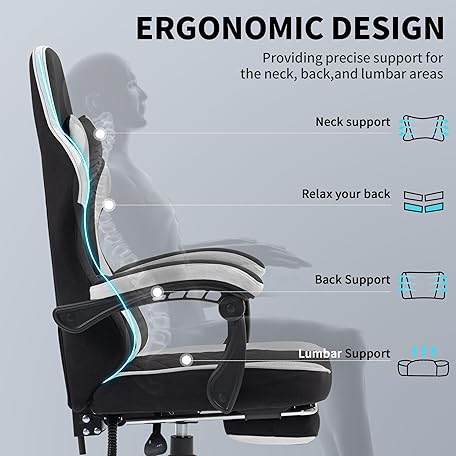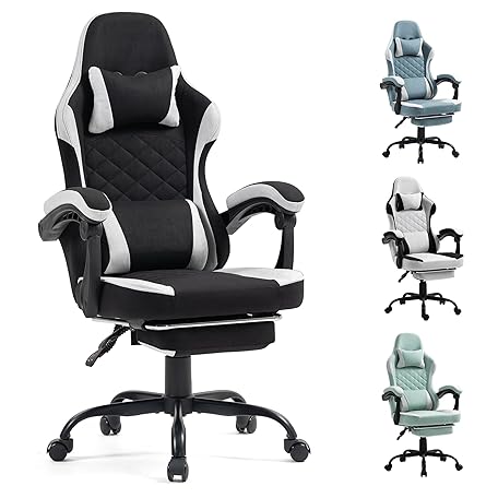Gaming Chair with Footrest for Adults - Ergonomic Gaming Chairs with Foot Rest - Big and Tall Computer Game Chair - Fabric Reclining Video Game Chairs with Spring Cushion - Black/Light Grey