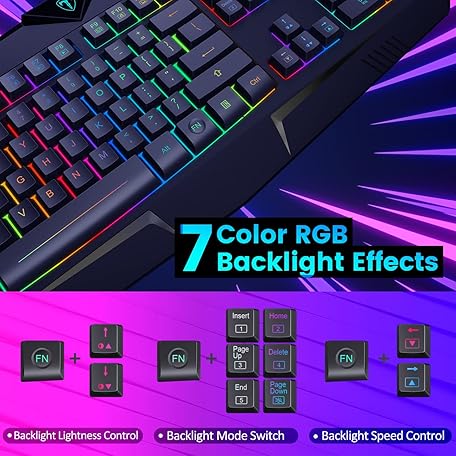Thông tin sản phẩm Gaming Keyboard, Full Size RGB Backlit Quiet Computer Keyboard, Wrist Rest, Silent Keys, Multimedia Keys, Anti-ghosting, Waterproof Light Up USB Wired Keyboard for PC Mac Xbox Gamer Office