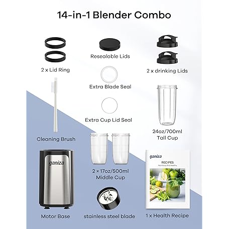 Thông tin sản phẩm Ganiza Blender for Smoothies, 14Pcs Personal Blender for Shake and Smoothies for Kitchen with 3 Portable Cups (1x24oz & 2X17oz), Single Serve Smoothie Maker, Nutritious Recipe
