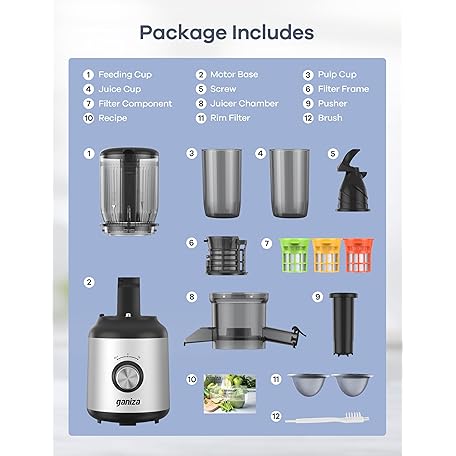 Ganiza Juicer Machines, Slow Masticating Juicers with Large Feed Chute for Whole Fruits & Vegetables, Cold Press Juicer with 3 Replace Filters for Batch Juicing, Easy to Clean, BPA Free(Silver)