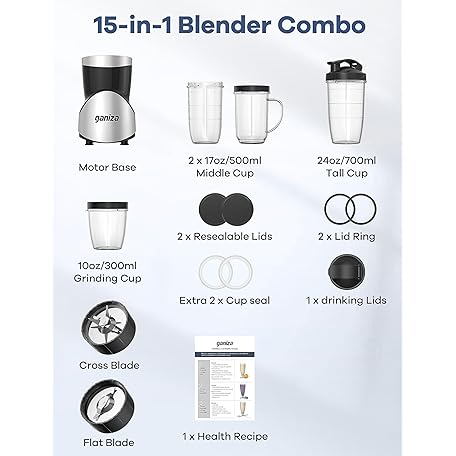 Thông tin sản phẩm Ganiza Smoothie Blender, 900W Blenders for Shakes and Smoothies, 15-Piece Personal Blender and Grinder Combo for Kitchen, Smoothies Maker with 4 BPA-Free Portable Cup, Nutritious Recipe