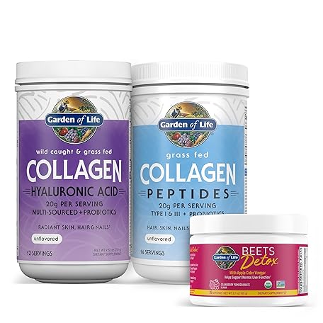 Thông tin sản phẩm Garden of Life Collagen Beets Bundle: Multi-Sourced Collagen Hyaluronic Acid Unflavored, 12 Servings + Organic Beets Detox Cranberry Pomegranate, 30 Servings + Collagen Peptides Powder, 14 Servings