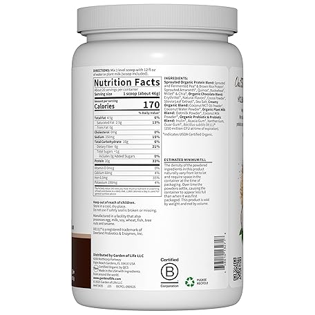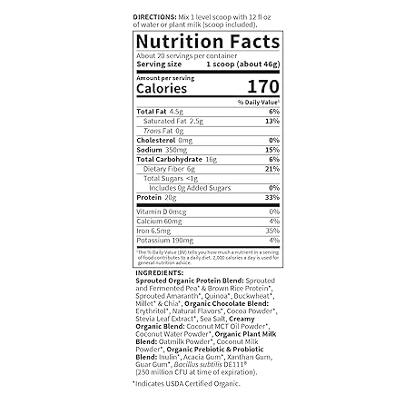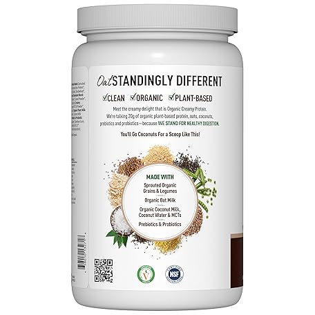 Thông tin sản phẩm Garden of Life Creamy Organic Vegan Protein Powder + OatMilk, 20g Complete Plant Based Protein, Coconut Water, MCTs, Sprouted Grains, Prebiotics, Probiotics – Gluten-Free, Chocolate Brownie, 2 LBS
