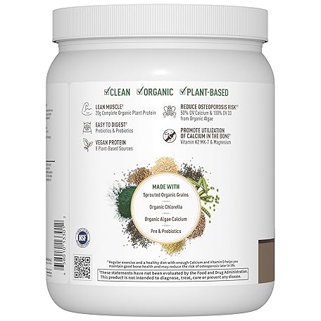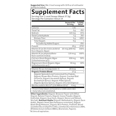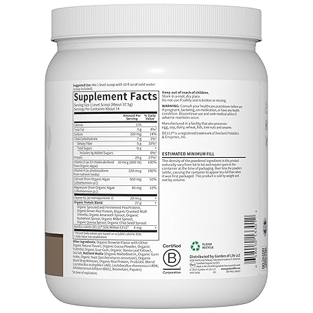 Thông tin sản phẩm Garden of Life Organic Vegan Protein Powder, 20g Plant Based Protein with Calcium, D3, K2 MK-7 & Magnesium for Bone Strength, Prebiotics & Probiotics for Digestion, Brownie Bites Flavor, 14 Servings