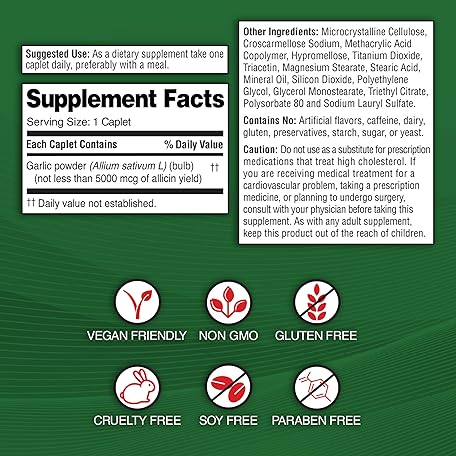 Thông tin sản phẩm Garlique Garlic Extract Supplement, Healthy Cholesterol Formula, Odorless & Vegan, 60 Caplets