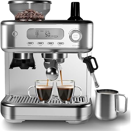 Garvee Espresso Machine Built-In Grinder, High Power Milk Frother, Digital LCD, Stainless Steel (Single/Double Brew)