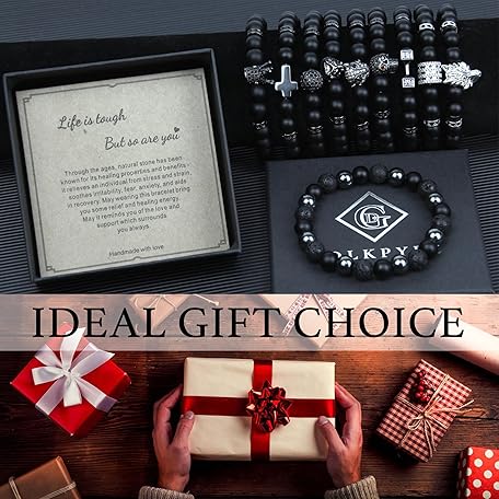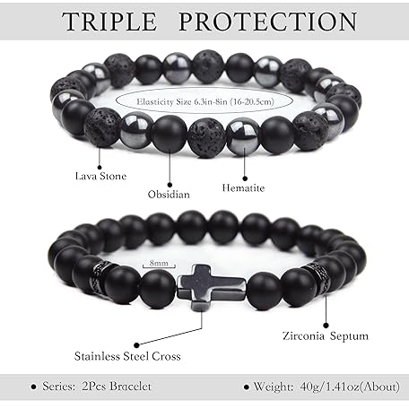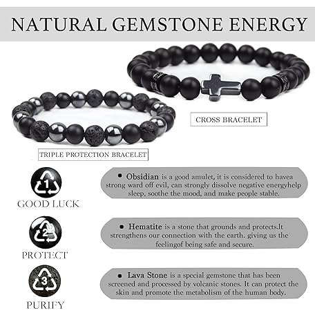GDLKPYHS Black Obsidian Bracelet for Men - Black Tourmaline Beaded Bracelets - Mens Bracelet Set 8MM Black Onyx Hematite Lava Stone Beads Triple Protection Bracelet for Men Women Gifts