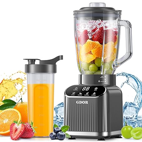 GDOR Professional Blender for Smoothies, 5 Functions, 1200 Peak Watts Smoothie Blender, 52 Oz Glass Jar & 24 Oz To-Go Cup Combo, Blenders for Smoothies, Ice and Frozen Fruit, Self-Cleaning, Gray