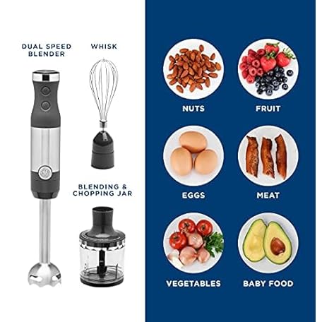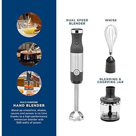 Thông tin sản phẩm GE Immersion Blender | Handheld Blender for Shakes, Smoothies, Baby Food & More | Includes Whisk & Blending Jar | 2-Speed | Interchangeable Attachment for Easy Clean | 500 Watts | Stainless Steel