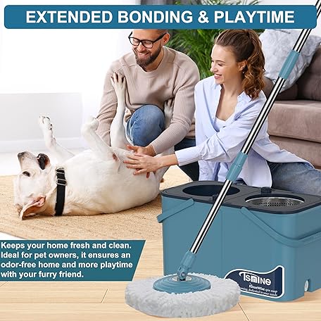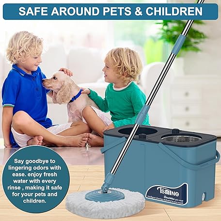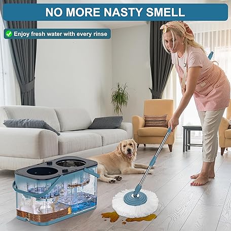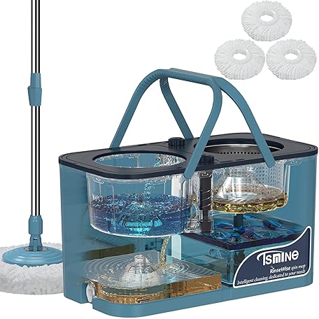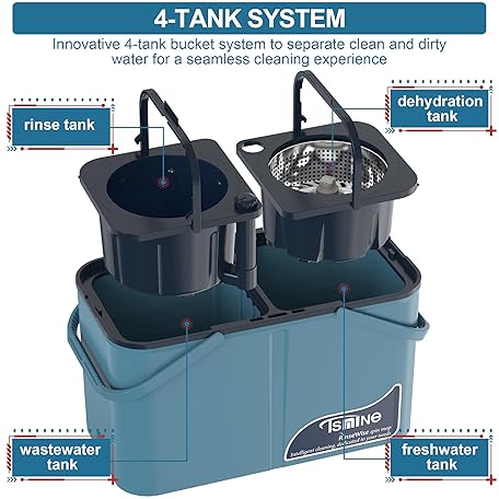 Thông tin sản phẩm Gen 1 Large-Capacity Spin Mop and Bucket – for Big Homes & Deep Cleaning Days,4-Chamber System Separates Dirty & Clean Water, 2-GAL Heavy-Duty Design with Wheels & 6 Refill Mop Heads - Blue/Grey