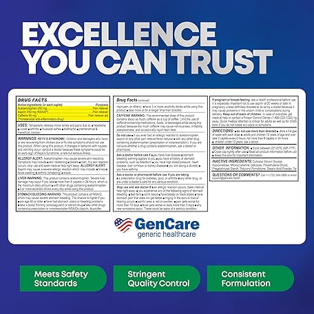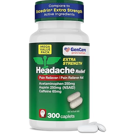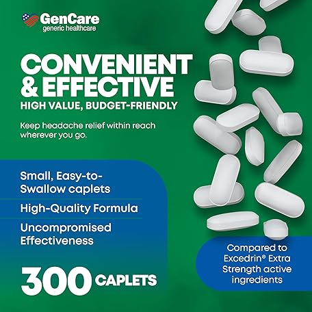 Thông tin sản phẩm GenCare Headache Relief Acetaminophen with Aspirin (NSAID) & Caffeine (300 Caplets) Value Pack | Head Pain, Muscle Aches, Back Pain & Body | Generic ExcedrEn Extra Strength