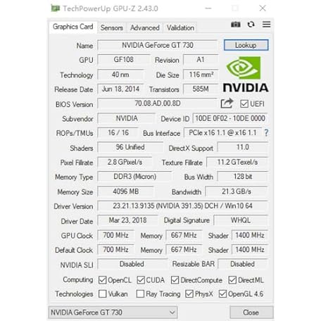 Sản phẩm Generic GT 730 LowProfile Graphics Card 4GB GDDR3 128 bit Bus PCI E x8 2.0. Low Power, no Power Cable Need. Core 700 MHz, Memory 667 MHz., Black đang được bán với giá ưu đãi là $67.5691 tại nước Mỹ.