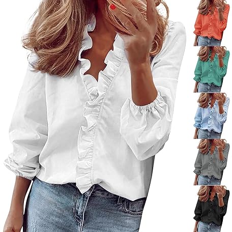 Generic Long Sleeve Shirts for Women Lantern Sleeve Tops V Neck T-Shirts Turn Down Collar Blouses Outfits Vacation Clothes
