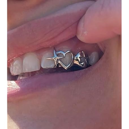 Generic Silver Gold Teeth Grillz for Women Grills for Your Teeth Men Gold Tooth Cap Grillz for Women Tooth Jewelry Hollow out Cross Heart Mouth Grills Men Hip Hop Outfits Custom Accessory Halloween Party
