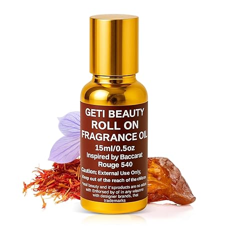 Geti Beauty Perfume Oil 15ml / 0.5oz Inspired by Bacarat Rouge 540 – Luxurious Alcohol Free Body Oil – Elegant Woody Ambery Floral Fragrance in Gold Roll-On Bottle – Premium Scent for Women & Men