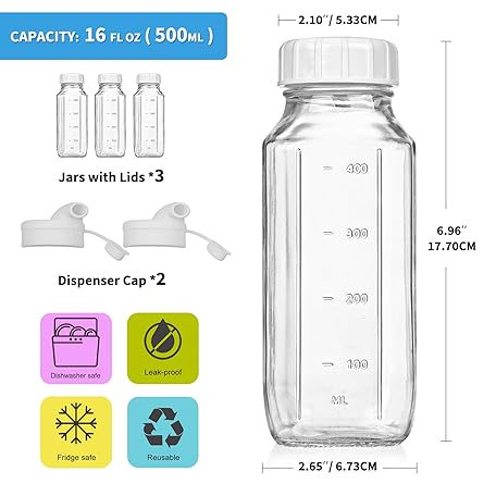 Thông tin sản phẩm Glass Juice Bottles with Lids, 3 Pack Clear Glass Water Bottles w 2 Pour Spouts, 16 Oz Reusable Milk Jug w 100% Airtight Cap and Scale for Juicing Containers, Breast Milk Storage, Drinking Jar