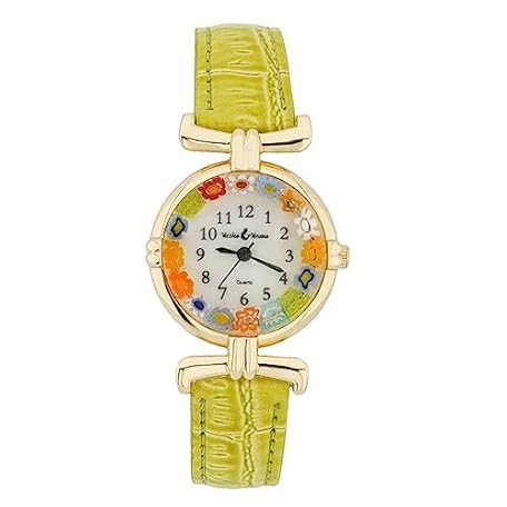 Glass Of Venice Murano Glass Millefiori Watch Round Multicolor Gold-Tone - 1" Face with Lime Green Band for Women - Handmade in Italy