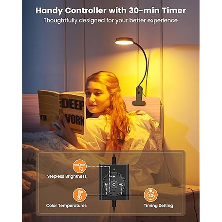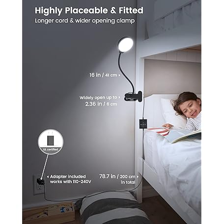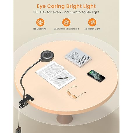 Thông tin sản phẩm Glocusent 5W Clip on Light, 36 LEDs Eye Caring Reading Light for Bed, 3 Colors & 5 Brightness Clip on Lamp with Adapter, Perfect Reading Light for Bed with Clamp/Bunk Bed/Headboard/Table/Desk