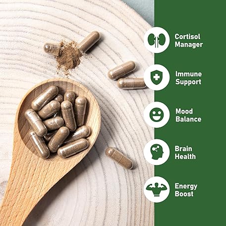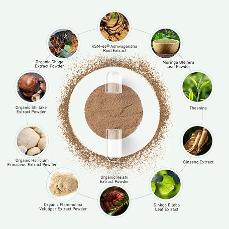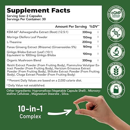 GlowEver KSM-66 Ashwagandha Supplements with L-Theanine Moringa Organic Mushrooms Complex Ginseng Ginkgo Biloba - Mood & Energy Support, Cortisol Manager, Immune Support, 60 Vegan Capsules