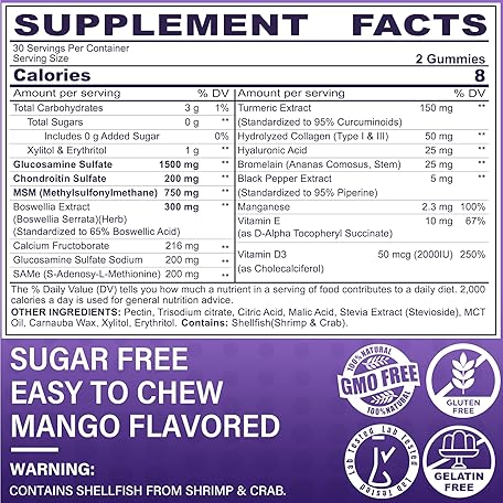 Thông tin sản phẩm Glucosamine Chondroitin Gummies, Sugar Free Glucosamine Chondroitin MSM Supplement, Extra Strength with Boswellia Turmeric, Hydrolyzed Collagen & Hyaluronic Acid, Bone Health for Men & Women, 120 Cts