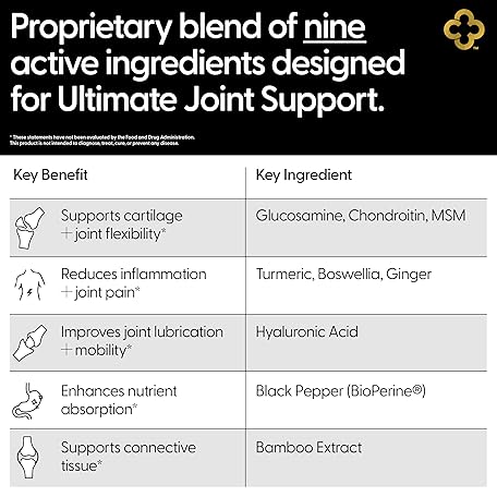 Thông tin sản phẩm Glucosamine Chondroitin MSM All-in-One Joint Support Supplement Turmeric, Hyaluronic Acid, Boswellia, Ginger Root, Bamboo, BioPerine, Black Pepper, Supports Joint Health & Flexibility 90 Count