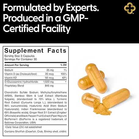 Sản phẩm Glucosamine Chondroitin MSM All-in-One Joint Support Supplement Turmeric, Hyaluronic Acid, Boswellia, Ginger Root, Bamboo, BioPerine, Black Pepper, Supports Joint Health & Flexibility 90 Count đang được bán với giá ưu đãi là $30.5091 tại nước Mỹ.